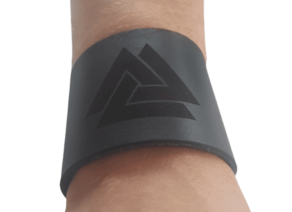 Häftigt armband i historisk stil tillverkat för hand i Sverige av Europeiskt läder. Armbandet är 18 cm långt och 6 cm brett. Baksidan har en snörjning med lädersnöre som gör att armbandet kan anpassas efter olika vristtjocklekar. Armbandet är till för att stödja vristen och skydda handleden mot skärsår. Det passar utmärkt till vandringen eller på en fisketur. Det har en häftig Valknut dekorerad på ovansidan.