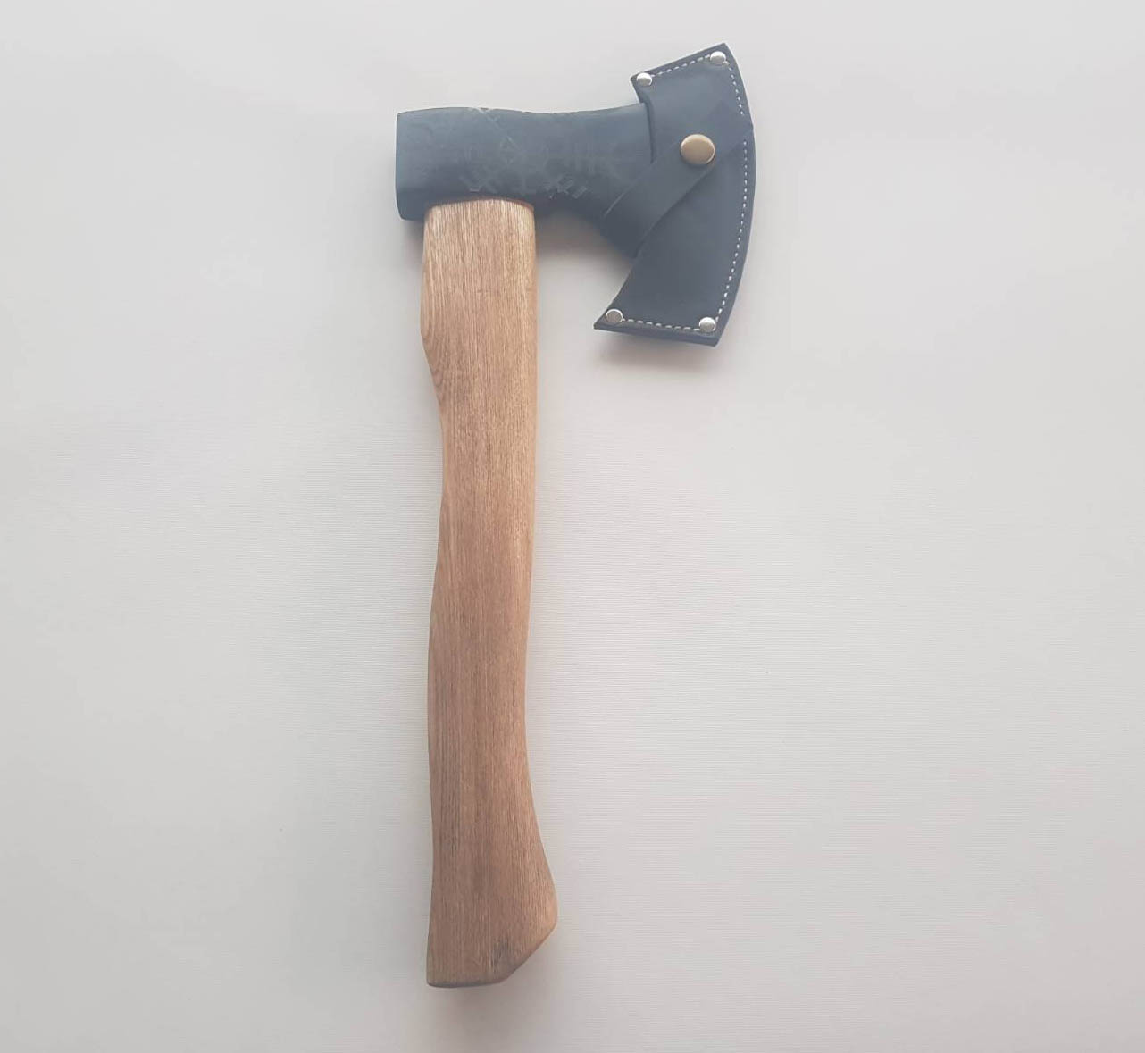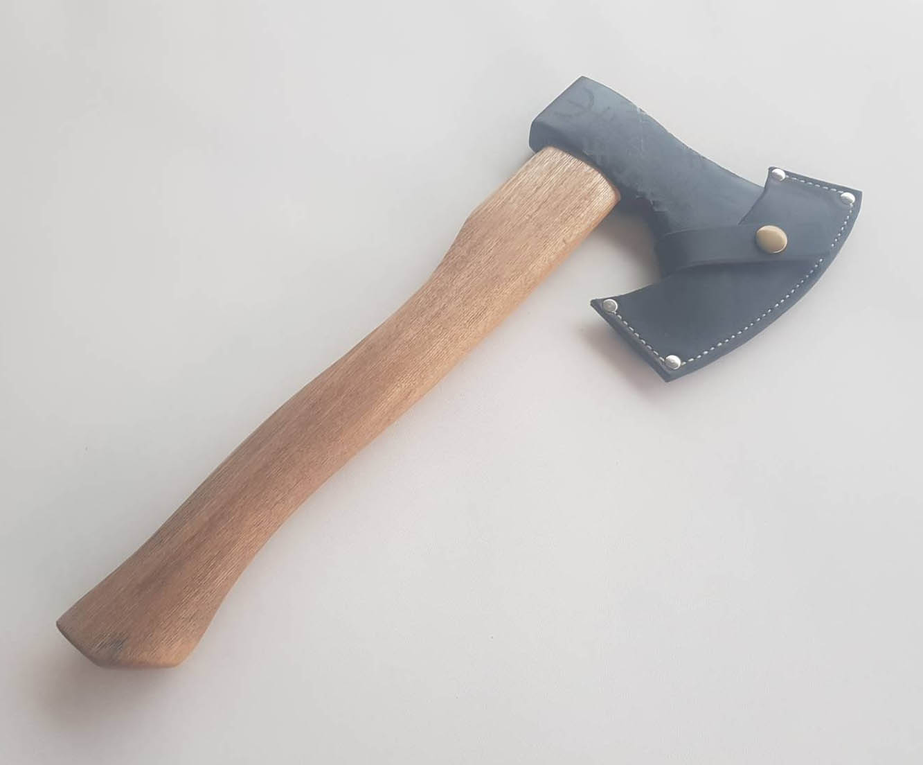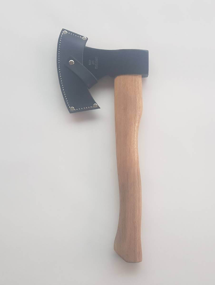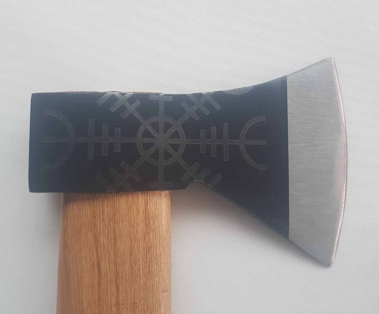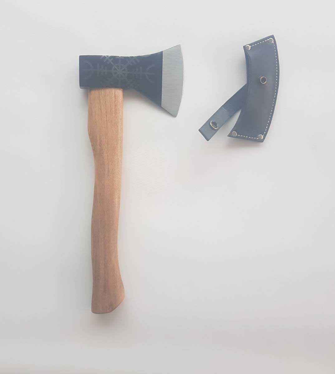 Rejäl friluftsyxa tillverkad i rostfritt stål med kraftigt handtag av trä. Yxan är graverad med Rungalden Ægishjálmur. Till yxan medföljer en lyxig läderslida som är tillverkad för hand i Sverige. Yxan är graverad, sandpapprad för hand och inoljad med svensktillverkad paraffinolja i Sverige.