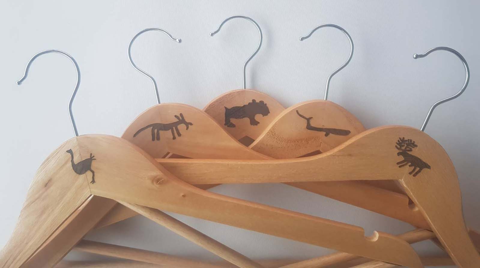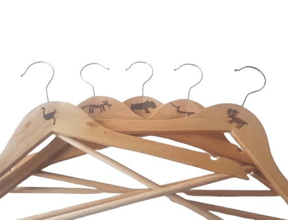 Vackra galgar tillverkade i trä och rostfritt stål dekorerad med djur-hällristningar. Galgarna är 45 cm breda och 22 cm höga. Galgarna är graverade, sandpapprad för hand och inoljade med svensktillverkad paraffinolja i Sverige. Beskrivning av motiven på galgarna: