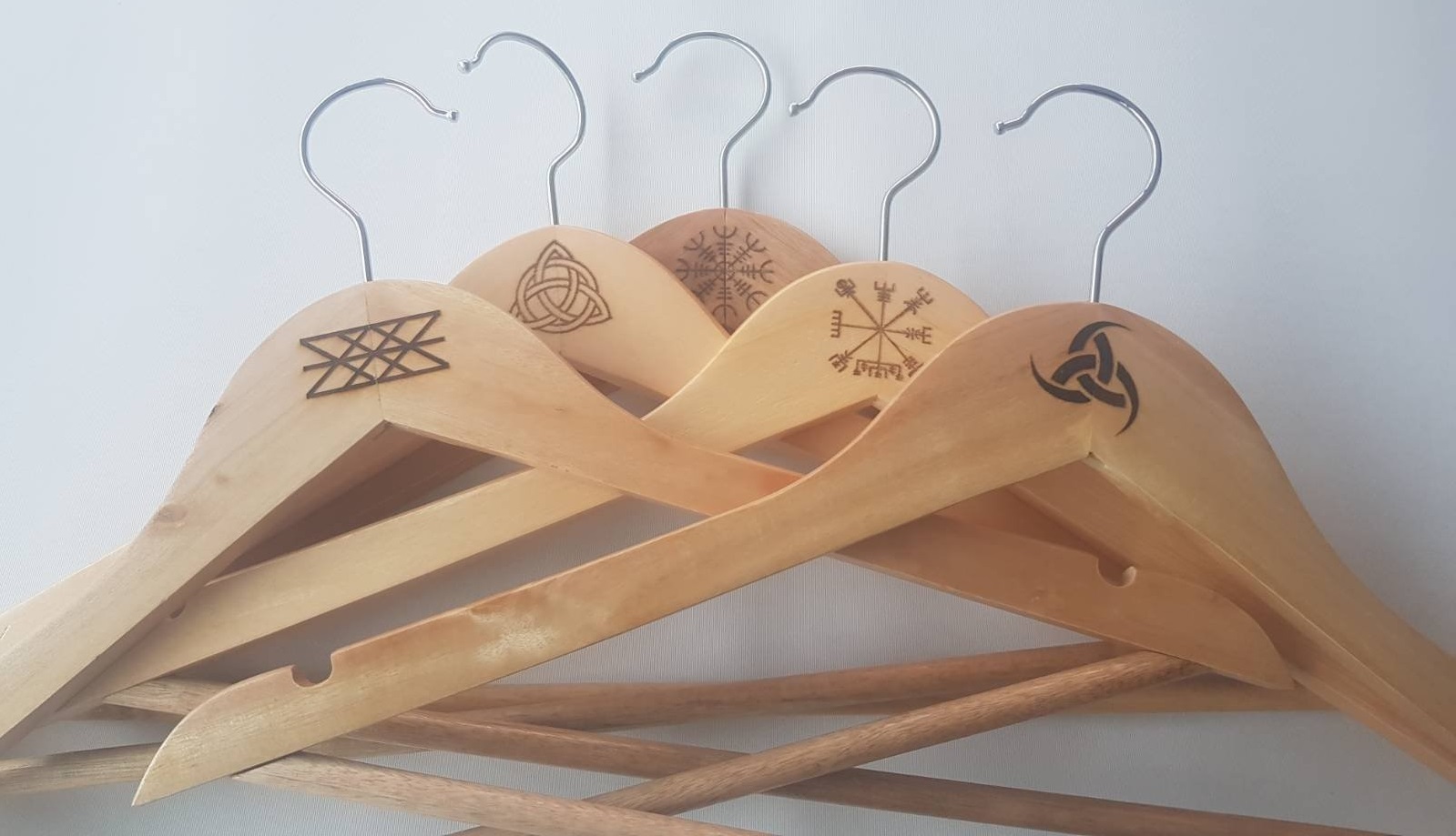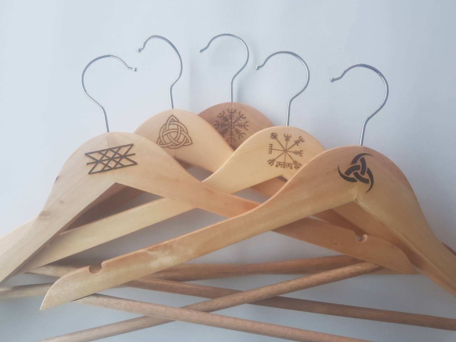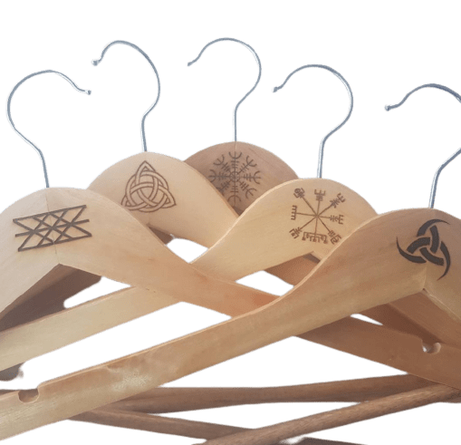 Vackra galgar tillverkade i trä och rostfritt stål dekorerad med historiska Vikingasymboler. Galgarna är 45 cm breda och 22 cm höga. Galgarna är graverade, sandpapprad för hand och inoljade med svensktillverkad paraffinolja i Sverige. Beskrivning av motiven på galgarna: