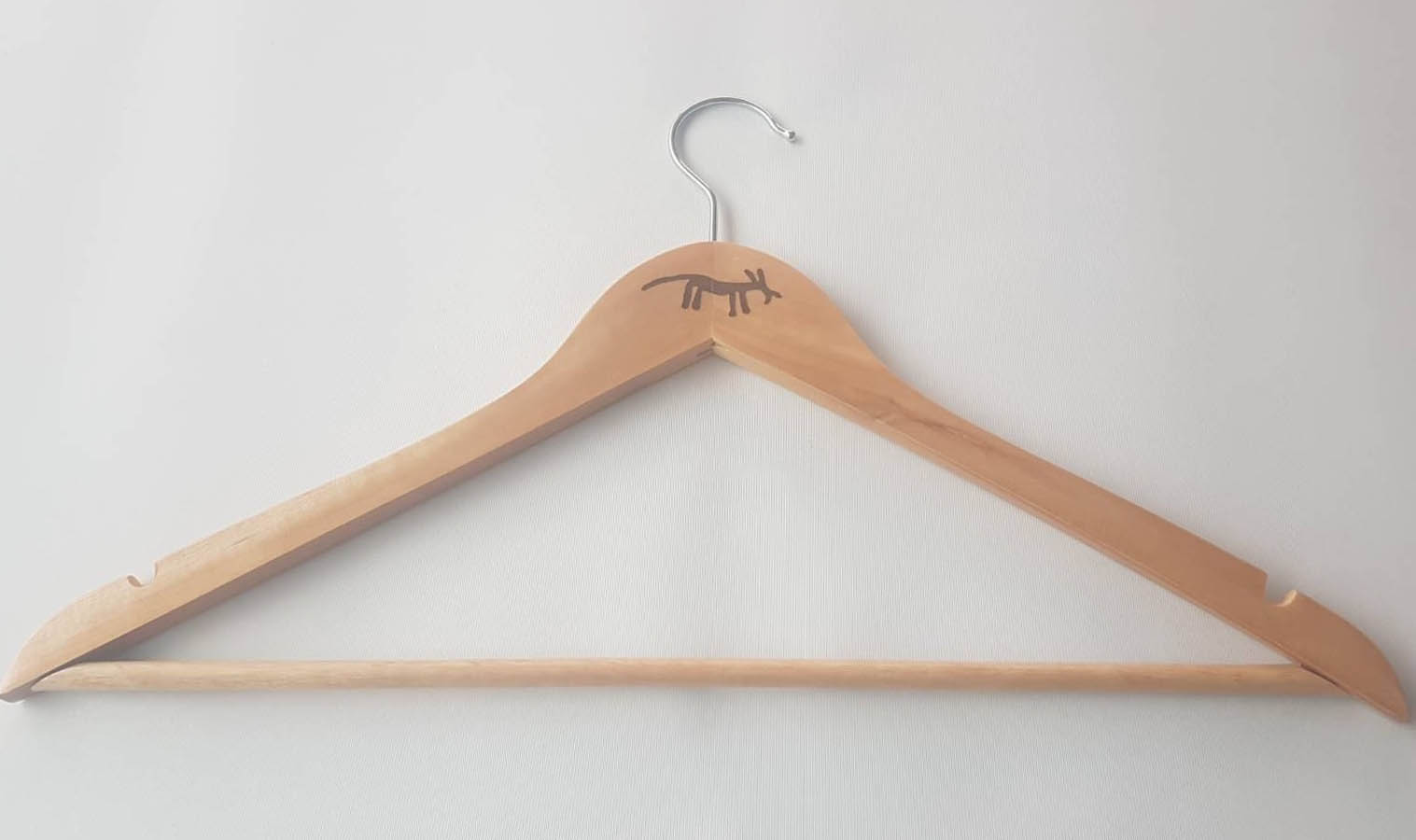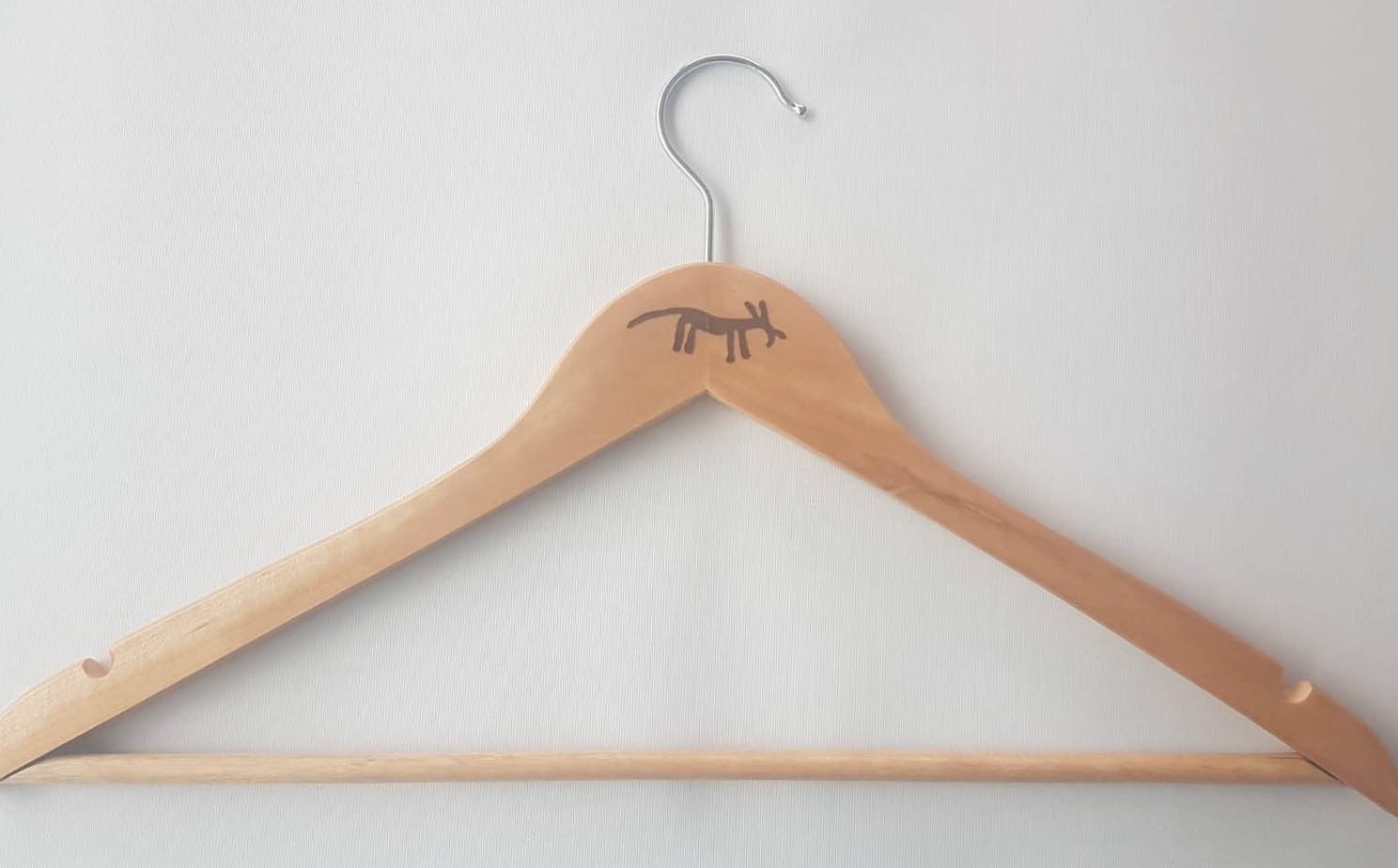 Vacker galge tillverkad i trä och rostfritt stål och dekorerad med en hällristning. Galgen är 45 cm bred och 22 cm hög. Galgen är graverad, sandpapprad för hand och inoljad med svensktillverkad paraffinolja i Sverige. Beskrivning av motivet på galgen: