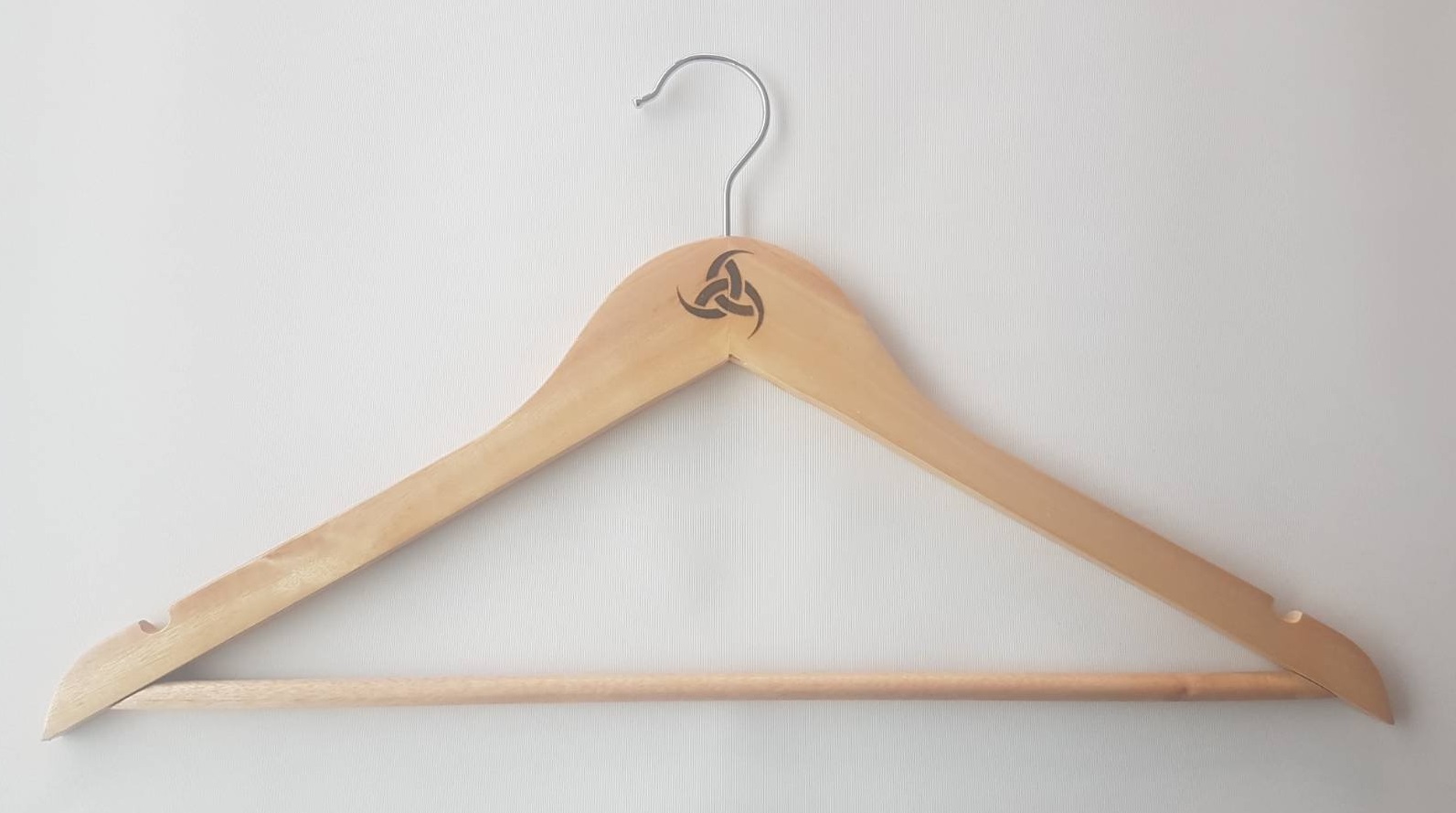 Vacker galge tillverkad i trä och rostfritt stål och dekorerad med Odens Horn graverad. Galgen är 45 cm bred och 22 cm hög. Galgen är graverad, sandpapprad för hand och inoljad med svensktillverkad paraffinolja i Sverige. Beskrivning av motivet på galgen: