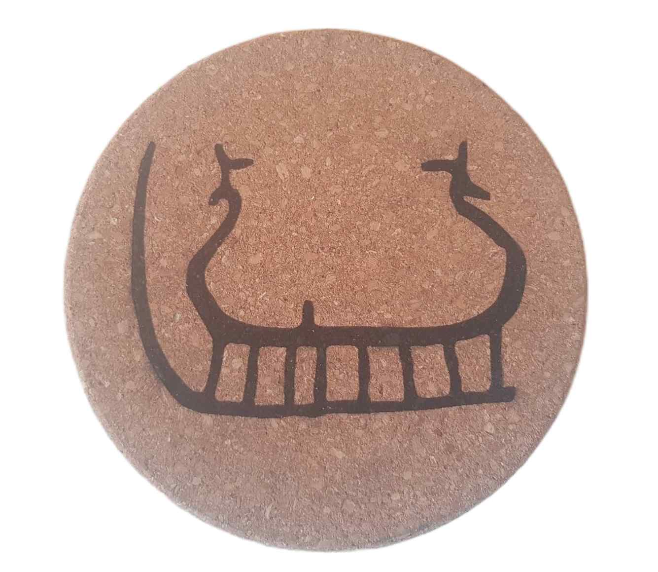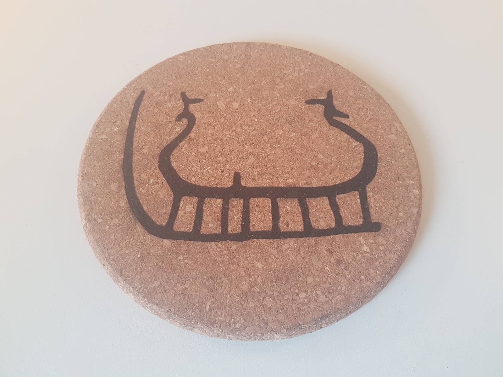 Det här häftiga grytunderlägget är tillverkat av kork. Det har en hällristning ingraverade snyggt i svart. Hällristningen är: