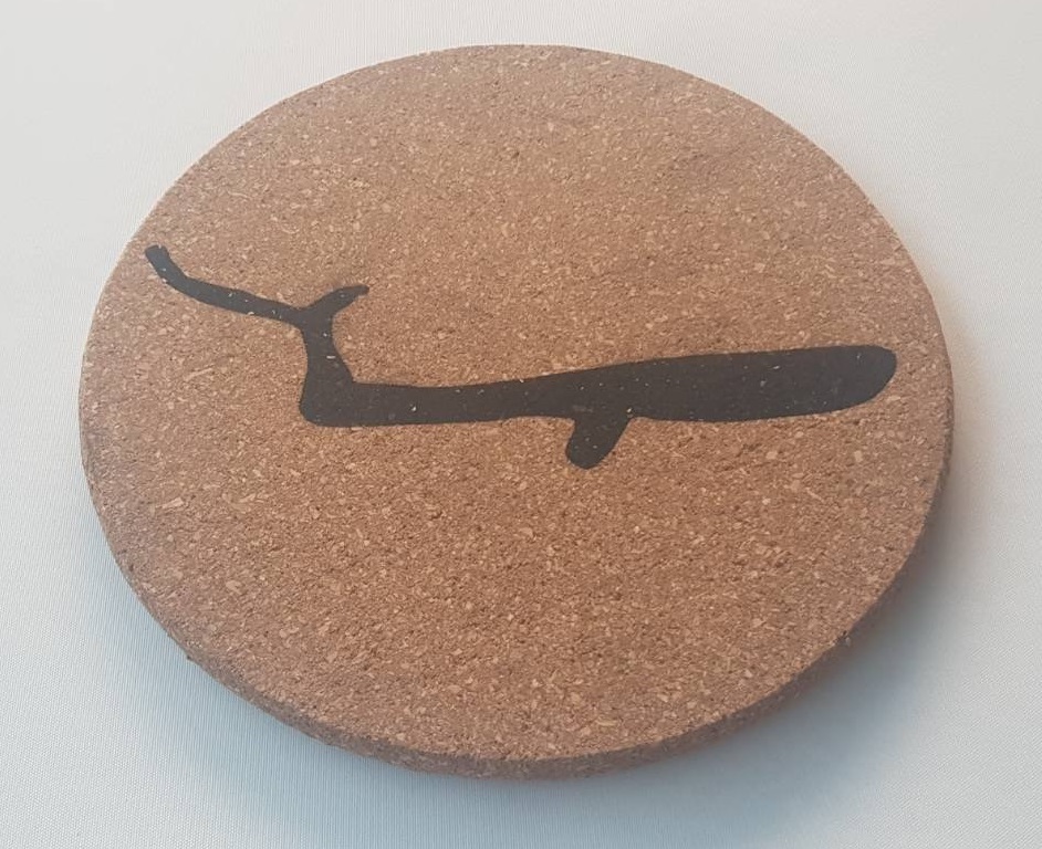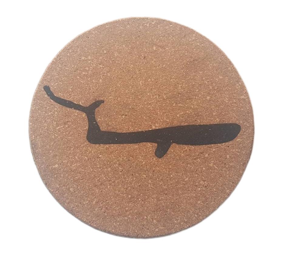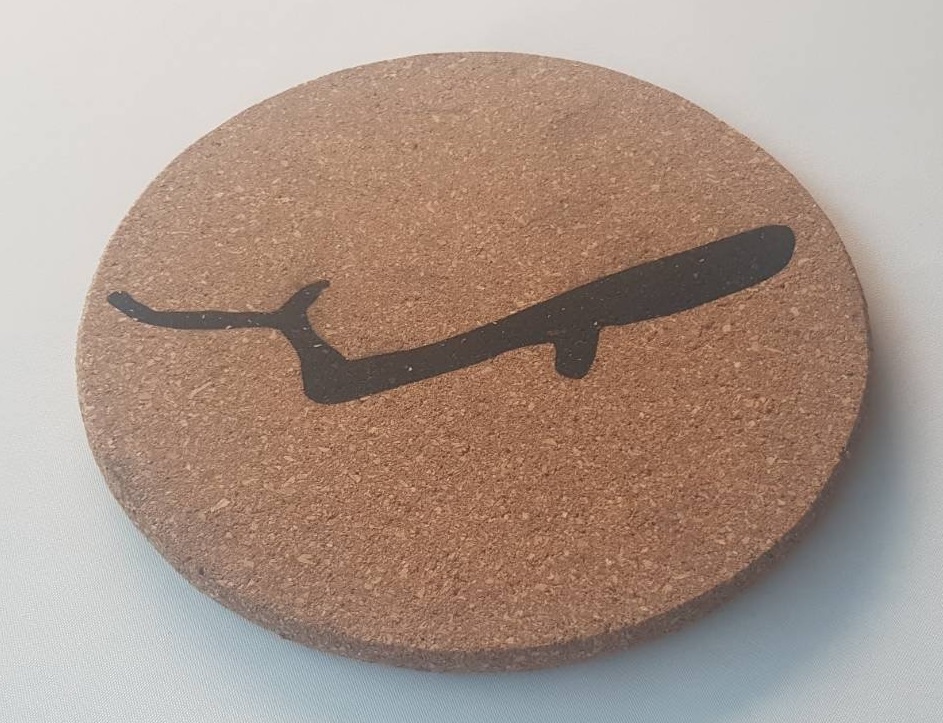 Det här häftiga grytunderlägget är tillverkat av kork. Det har en hällristning ingraverade snyggt i svart. Hällristningen är: