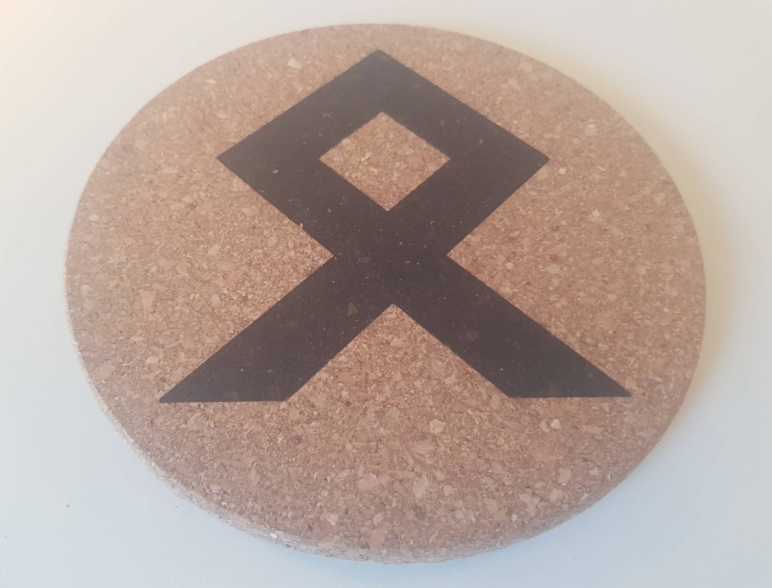 Det här häftiga grytunderlägget är tillverkat av kork. Det har Odalrunan ingraverat snyggt i svart.