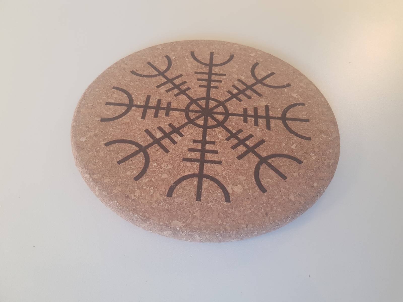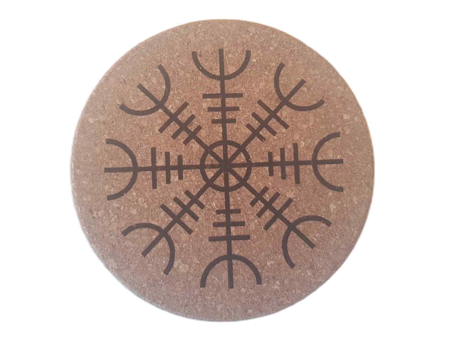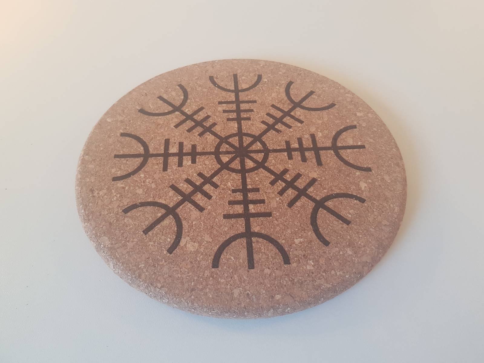 Det här häftiga grytunderlägget är tillverkat av kork. Det har Ægishjálmur ingraverat snyggt i svart.