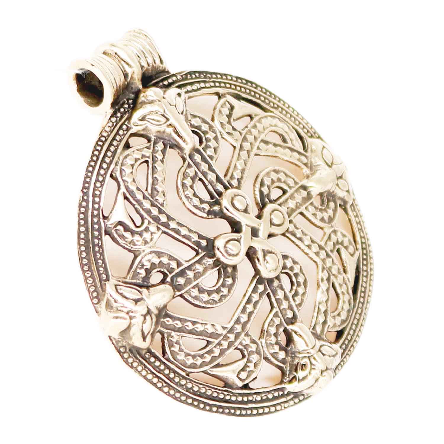 Stort och vackert halsband tillverkat i Brons. Det föreställer ormar i Urnesstil.
