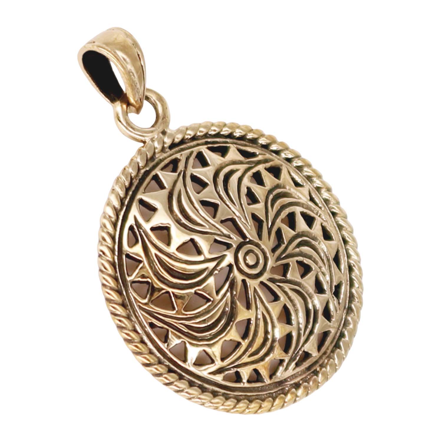 Vackert bronssmycke föreställandes ett forntida Solhjul. Motivet är från Sanda Runsten, Gotland. Det är uppskattningsvis från 400 f.Kr. Alla våra Silver- och Bronssmycken är självklart nickelfria.