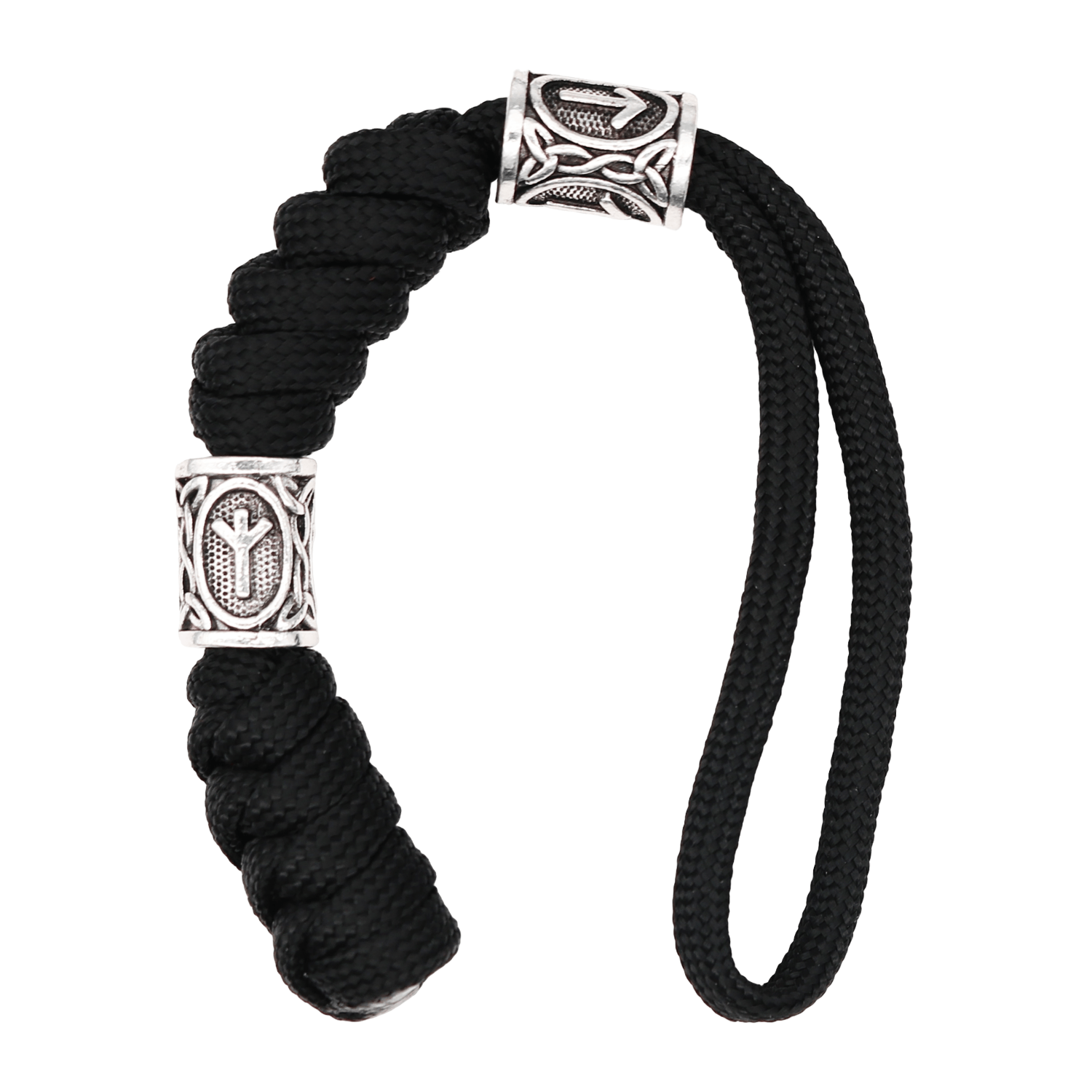 Rejäl och vacker nyckelring dekorerad med pärlor. Pärlorna är dekorerade med Runor från Futharken. Snöret på nyckelringen kan knytas upp och användas ifall det behövs. Nyckelringen kan också användas till andra saker, exempelvis att hängas på dragkedjor eller väskor som dekoration.