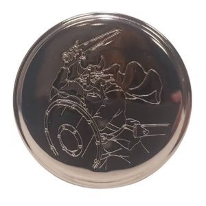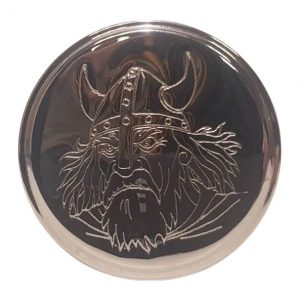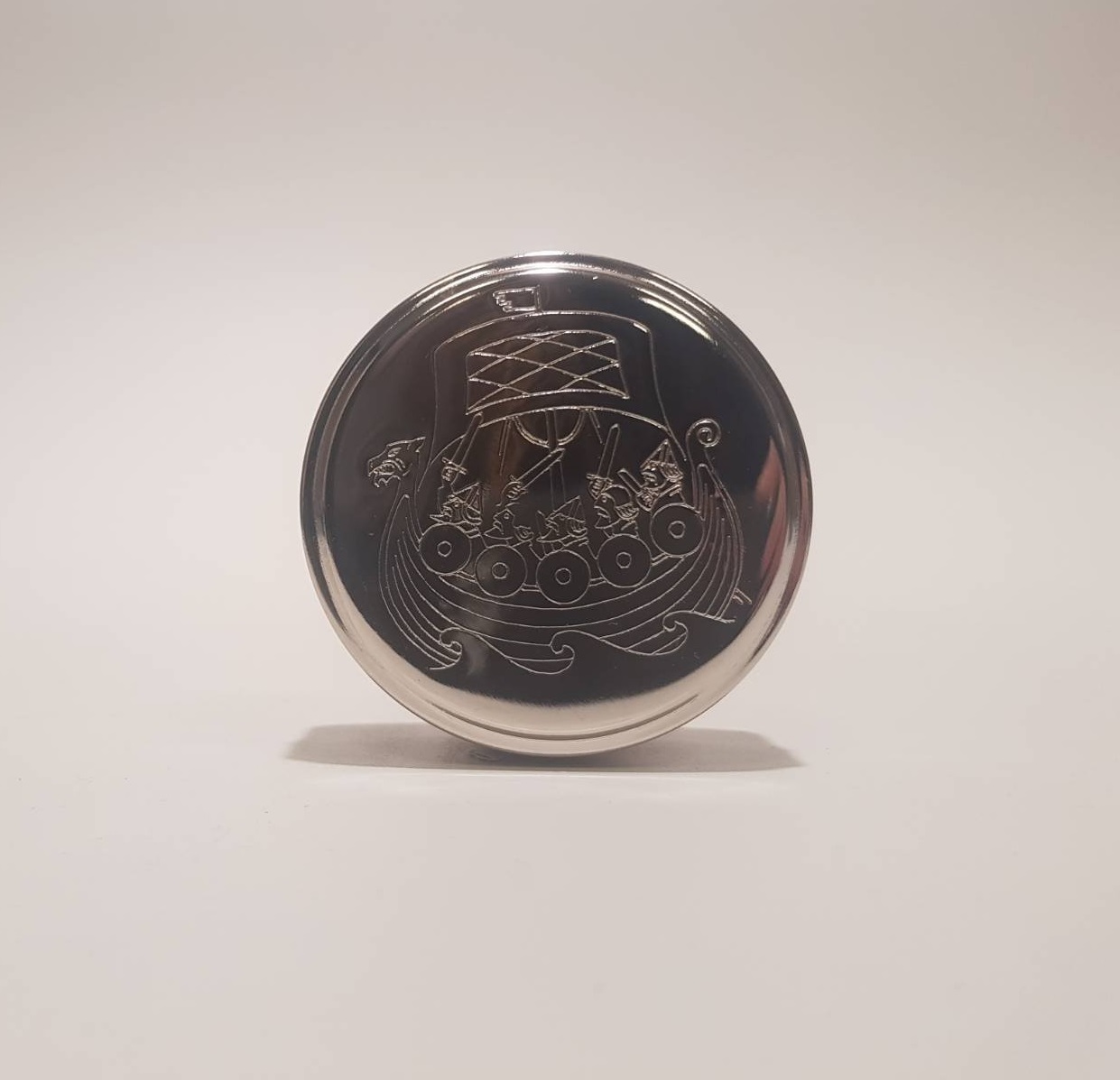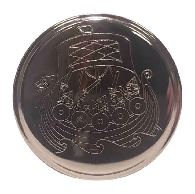 Fin snusdosa i kromad plåt dekorerad med ett Vikingaskepp.