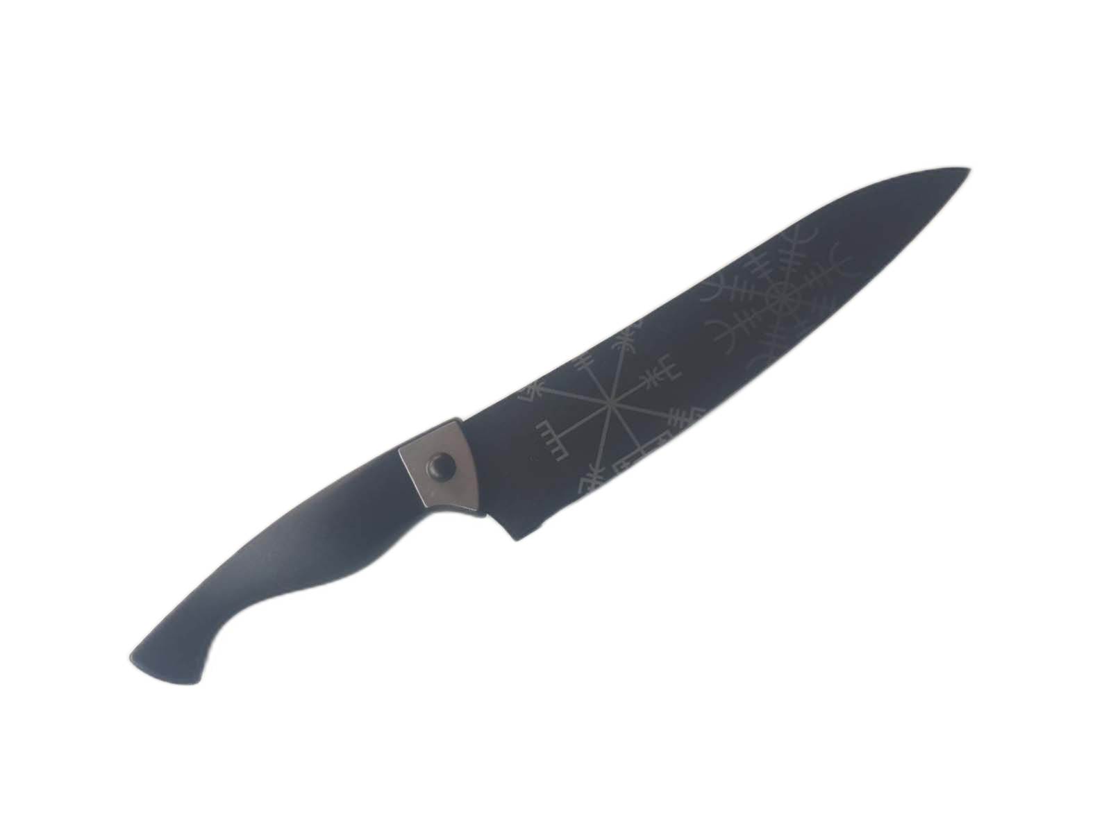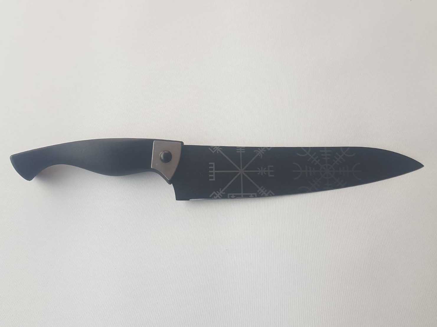 Sylvass kökskniv vackert dekorerad med rungaldrarna Ægishjálmur och Vegvísir.