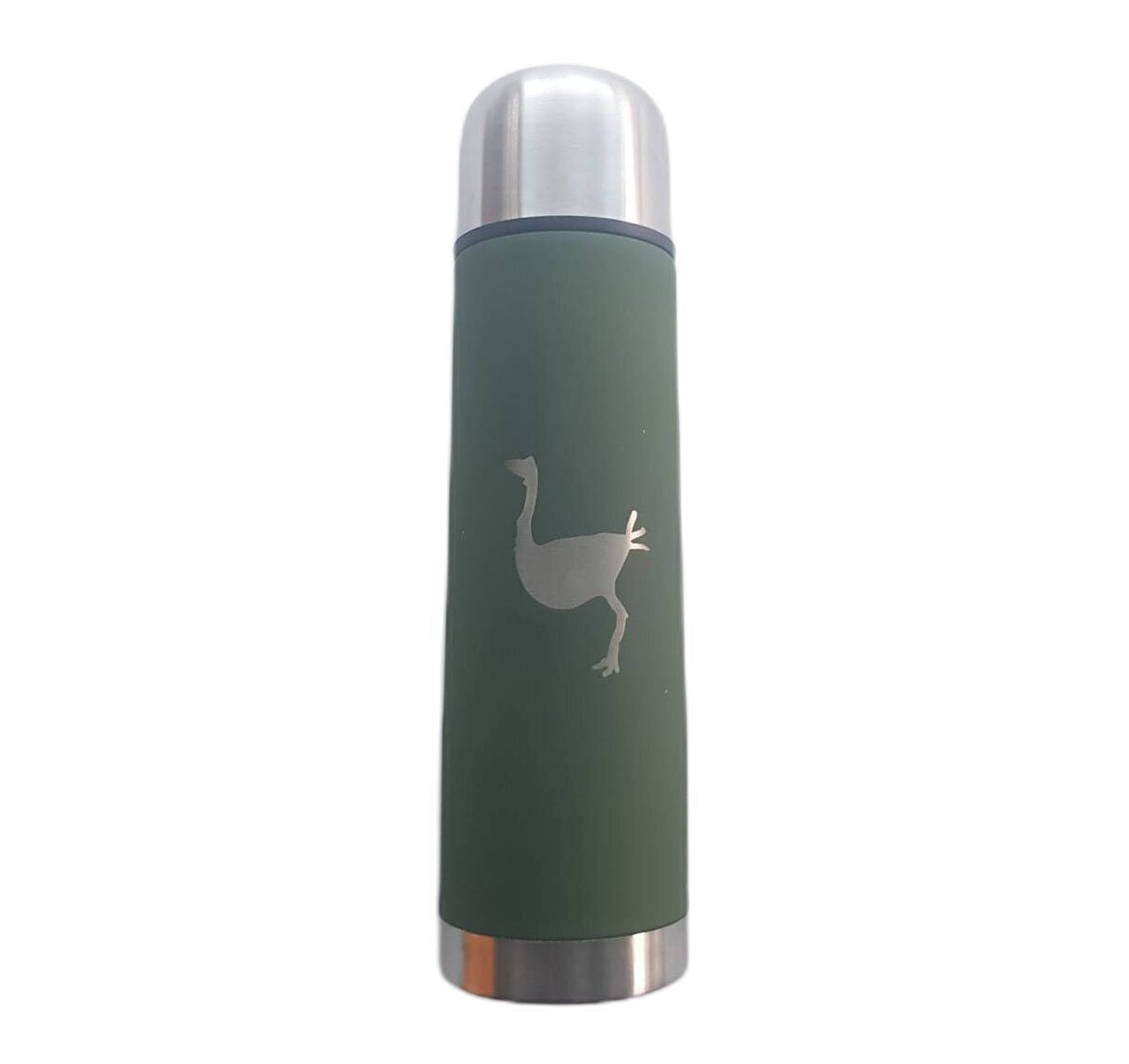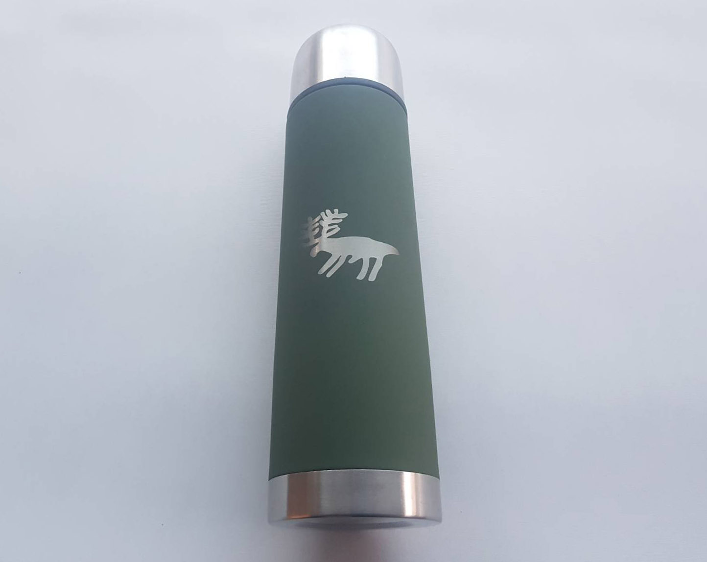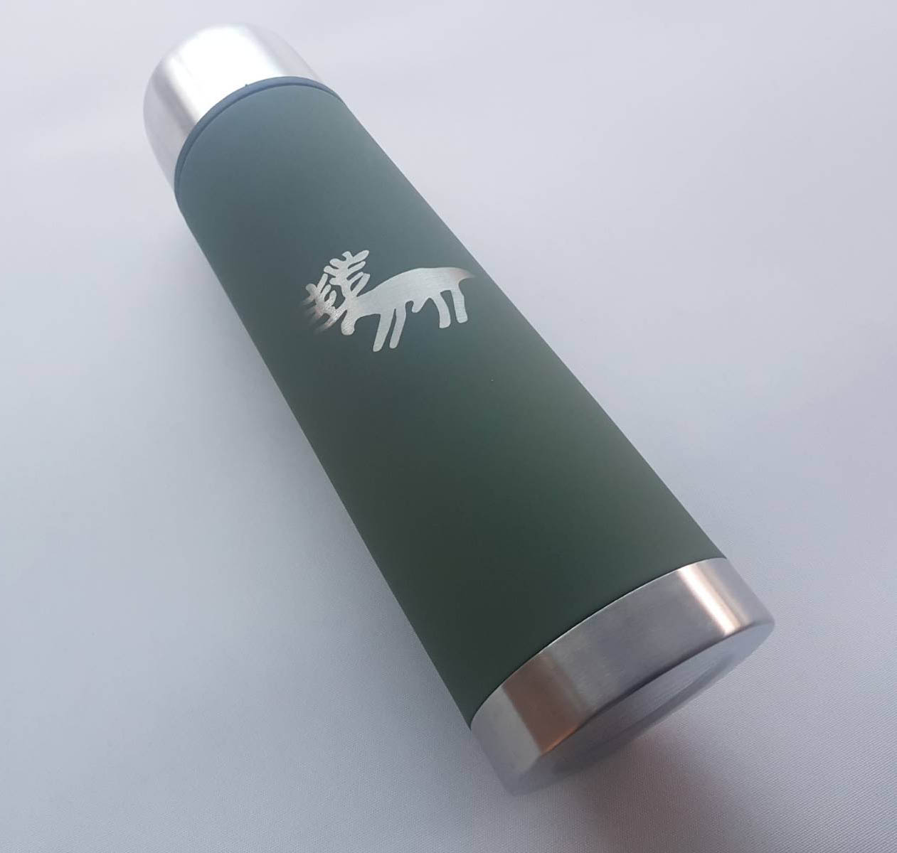 Högkvalitativ termos tillverkad av rostfritt stål. Termosen är dekorerad med en hällristning: