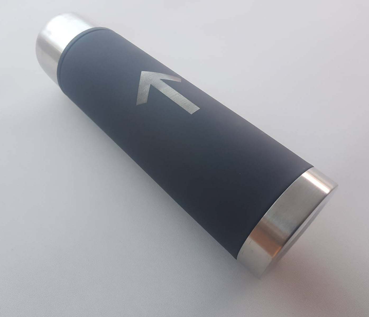 Högkvalitativ termos tillverkad av rostfritt stål. Termosen är dekorerad med en Tyrruna.