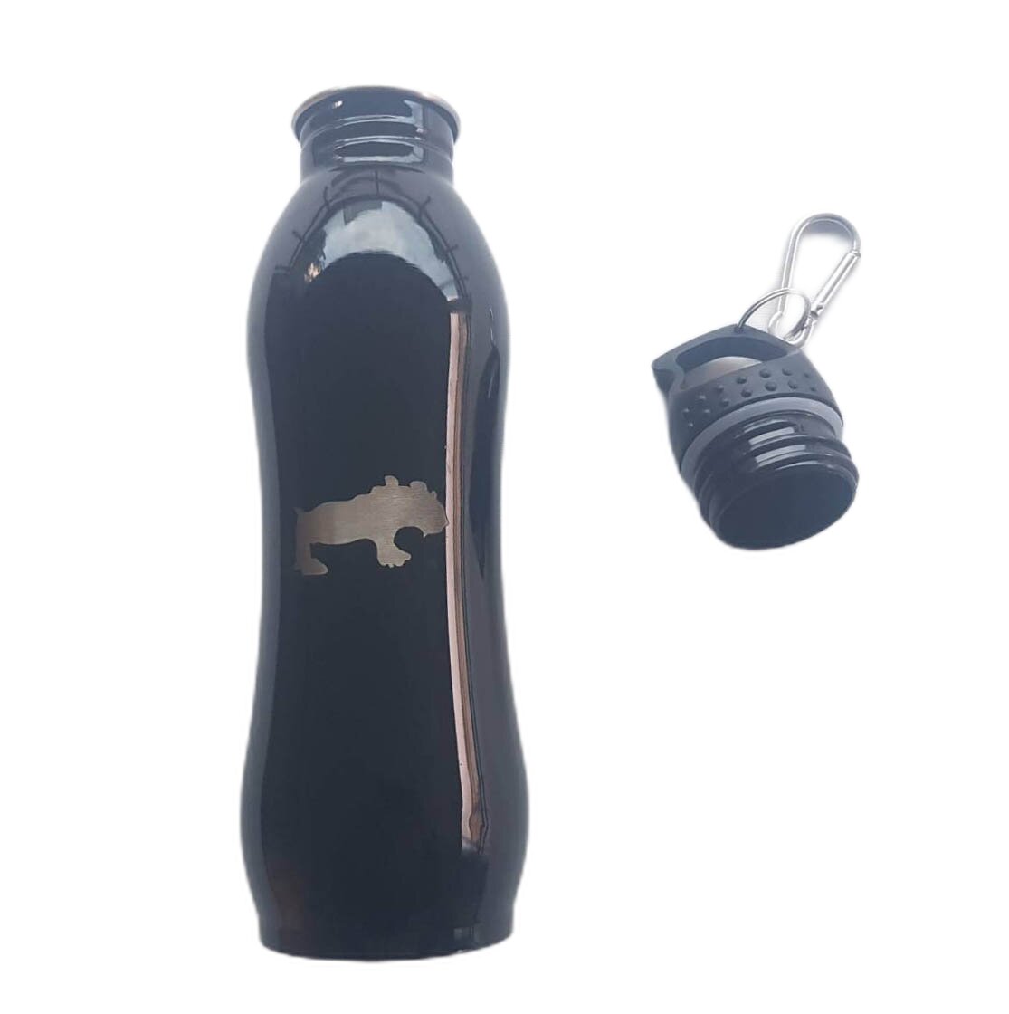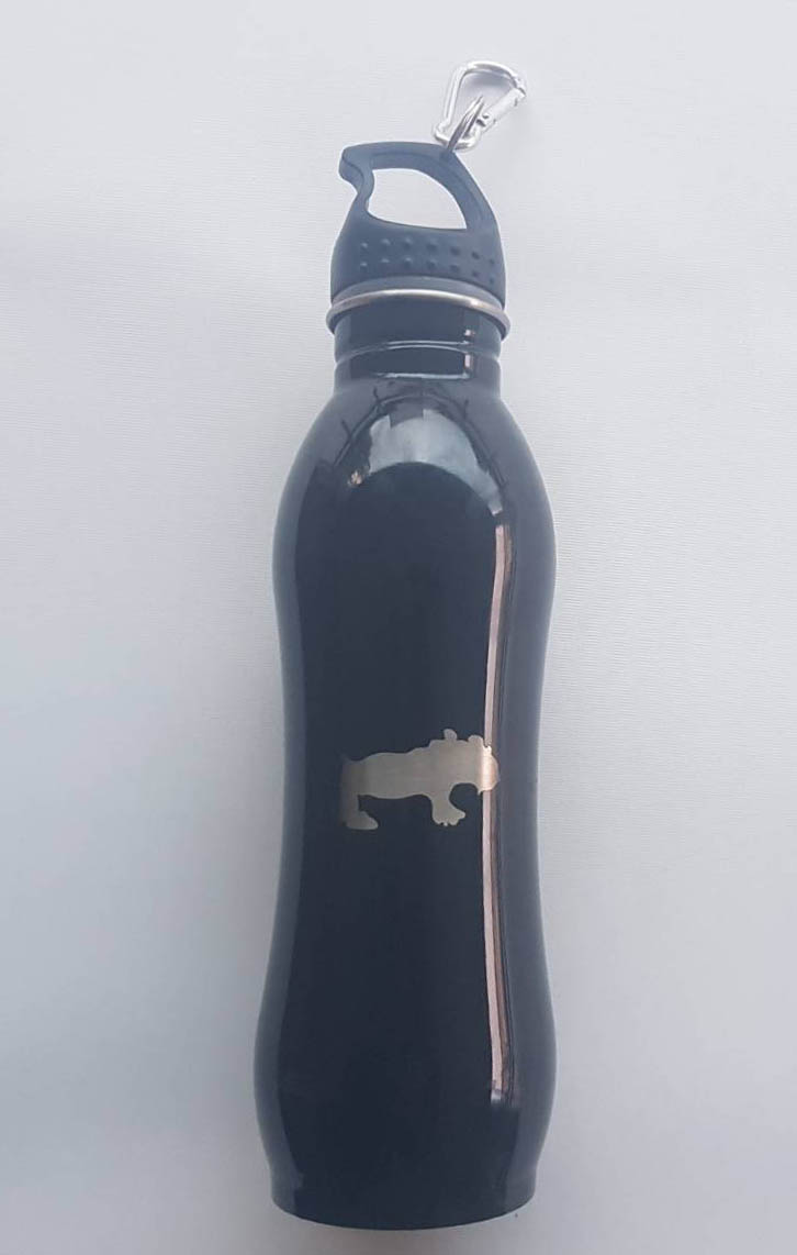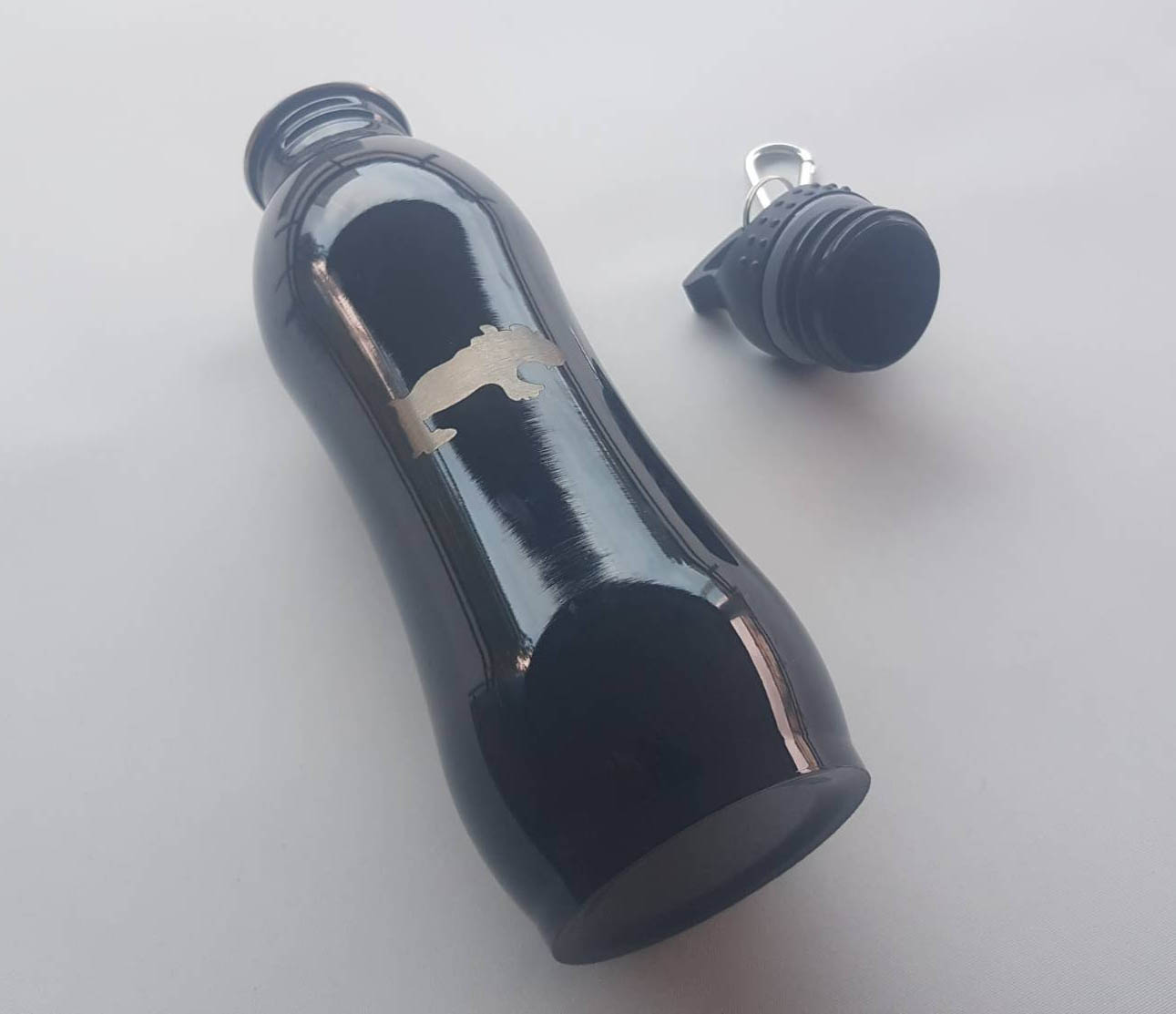 Högkvalitativ vattenflaska tillverkad av rostfritt stål. Korken har en karbinhake för praktisk medtagning. Flaskan är dekorerad med en hällristning: